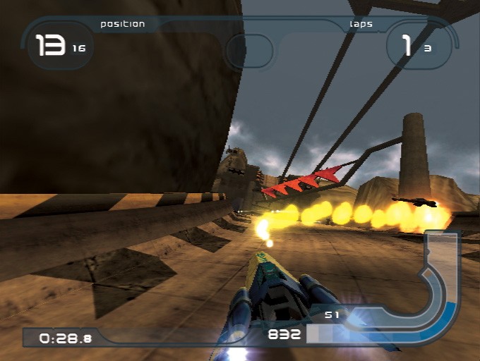 遊戲簡介: 本遊戲是由 SONY 所製作,曾於 PS 上推出的科幻賽車遊戲,以未來反重力浮游賽車為主題,遊戲中玩家將穿梭在反重力賽道上,體驗超音速的極限飆車快感,以及攻擊與被攻擊的刺激對決。 遊戲圖片:
