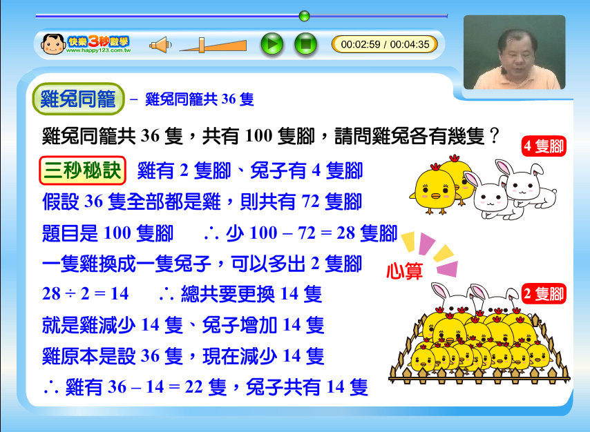 【檔案名稱】:快樂三秒數學國小第一集-三秒數學-2.雞兔同籠問題