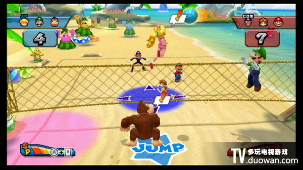 登場角色涵蓋瑪莉歐,路易,碧姬,庫巴,耀西等;本作內支援攻擊道具,像是用庫巴的龜殼阻擋敵方進攻,或是用迷你蘑菇讓排球回到對方範圍時瞬間變小,讓人難以反擊進而得分。另外,每位角色具備專屬攻擊能力,在場上撿拾金幣可獲得額外分數。