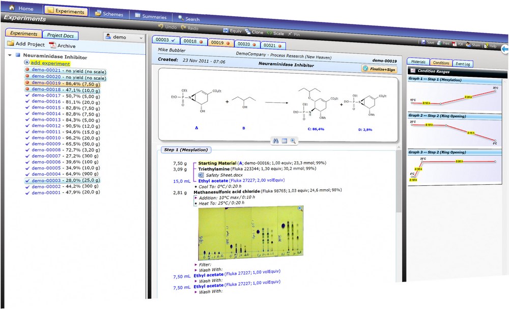 Espresso ELN is a fully featured electronic lab notebook (ELN) suited for organic, organometallic, polymer and peptide chemistry, featuring a strong protocol editor, detection of synthetic context, substructure searches and optional data sharing and backup via server. It combines simple and intuitive handling with state of the art and beyond interface and functionality and is suited for all needs, ranging from universities and small companies to big pharma teams.