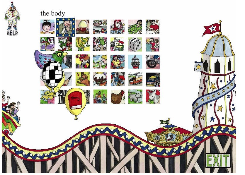 ◆學生可依據光碟內的指示挑選自己想要進行的單元和課程。光碟主頁左上的小丑是幫助學生了解該如何進行遊戲的輔助者。而下方的小車車會依照停在軌道上的位置不同,來選擇你要練習的單元。