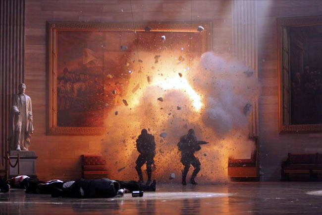 片中遍及烈焰紛飛的爆炸場面,設計最為精細的兩組鏡頭都一次完成。一組是總統被綁架時牆體破裂的大洞,一組是特製的福特F-150卡車被坦克砲擊中時騰空飛起。在後者的特技設計中,汽車地盤上被安裝了彈射器,特技人員有效的消除了彈射器的火焰,叫人看不出一絲破綻。