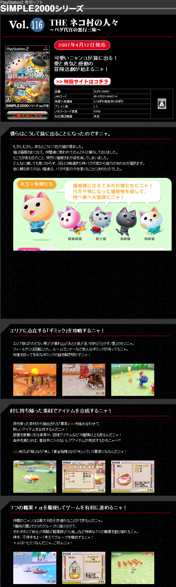 SIMPLE2000的遊戲的第116個作品再次登錄PS2平臺。遊戲設有平原,黃昏山,和和城,醜的村莊,解不開的村落等各種風格獨特的場景,除了普通的戰鬥外,玩家更需要在不同的場景玩到不同的小遊戲才能順利通關。主角可以找到其它小貓成為自己的夥伴一同作戰,同時劍客、使者、雜技演員、消防員等七種職業配合材料收集合成數量龐大的道具也一定可以讓簡單的遊戲派生出許多不同的別有樂趣的玩法。