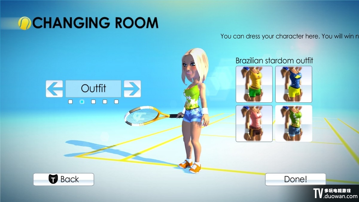 遊戲提供超過30款比賽場地,讓玩家擺脫地理限制,隨時跳入巴西的科帕卡瓦納海灘(Copacabana)、日本富士山山腳和迪拜的都市夜景(Skyline)等世界著名地標,於不同的美景下展開比拼。遊戲內有11位各具所長的運動健兒讓玩家自行選擇最符合你個人性格的角色。玩家亦可自由創作角色的造型,超過30多款的服飾,髮型,及15款設計獨特的球拍任你挑選。