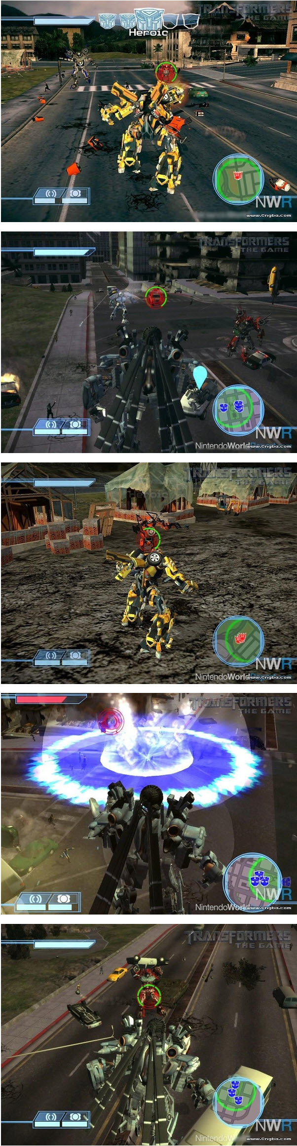 一開始可以選博派或狂派進行遊戲,博派初期是個人認為初期還是狂派爽快點,我果然是壞人。狂派出來先是直升機,一上來就是瘋狂破壞基地的任務,盡情發洩吧,第二關還可以操縱自身放出的機器蝎子,鑽地前進有點意思,之後則會用野馬警車進行任務了。遊戲採用GTA式自由接任務的設定,綠色為新任務,完成後變為橙色並可以再次挑戰。平時沒事可以上街搞搞破壞,同樣也會有破壞指數,顆數越多招來的警察也越多越瘋狂。想做良好市民也行,多消滅壞人吧,就可以提升英雄指數了,也許下次你執行任務的時候,前面還有警車給你護航呢。除此之外,路上還有不少可以玩特技的地方,也有可以收集的箱子之類,達成一定條件就可以開啟CG的瀏覽了,還有上百張的圖片,其中也不乏經典。說到遊戲的重心——變形,遊戲中經常要先變形為汽車去追逐敵人(可用氮氣加速,操縱感還過得去,遺憾的是不能換視角),當逼停敵人後,一個跳起、變形、落地,一氣呵成,感覺很酷,然後就可以玩肉搏了。解體機器人的一瞬還會慢鏡表示。 .