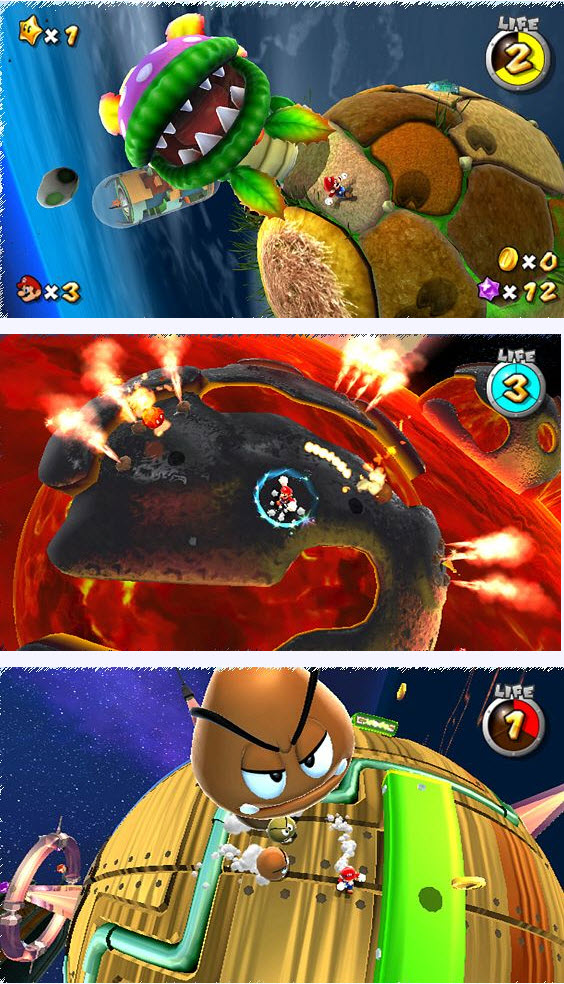 在最新的《超級馬里奧銀河》中,玩家可以不再顧及地心引力的束縛,自由地在銀河系的各個行星之間展開冒險。而Wii手柄的各種獨特功能也將在遊戲中得到充分地發揮,玩家只要輕輕晃動手中的手柄就可以控制馬里奧自如的行動,而且還可以用手柄投擲道具進行攻擊。所有這一切都告訴我們,次世代的馬里奧來了!
