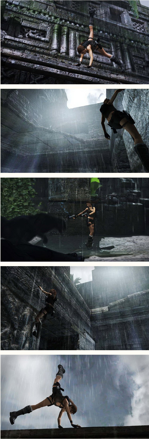 在馬雅文明遺址裡,有許多地方都是製作小組在當地拍照後製作出來的,所以算是相當逼真,而蘿菈在本次的冒險當中,將有更多的動作來突破難關,當然啦!陷阱和謎題也更加的困難了。配合強化的物理引擎,玩家將可以控制蘿菈利用場景或物品來做更多的動作,不再只是傻傻的攀爬、跳、攀爬。而是可以利用繩鉤、滑行等等,也要常常配合場景上不起眼的小東西來過關,像是故意把石頭擊落,或是到處丟丟繩鉤,就會發現原本無法移動的地方,在冒險上雖然難度可能會增加,但也讓蘿菈的冒險更加逼真!