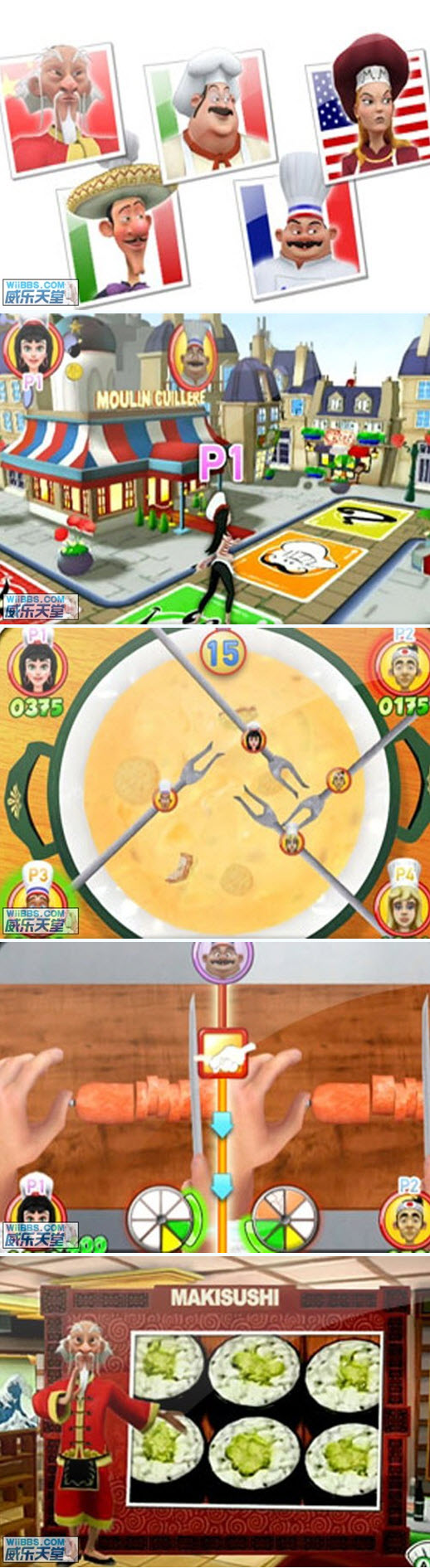 ■遊戲簡介本作是款聚會類的烹飪遊戲,你將有機會挑戰來自全球各地的名菜料理做法。遊戲提供了40個有趣的迷你遊戲,最多支持4人同時參與。玩家將使用wii Remote去完成各種烹飪動作,比如燒、煮、烤、切、滾……完成遊戲不同的模式後,還可以逐一解鎖包括Ratatouille、Cheese Fondue、Maki Sushi等在內的新菜式。包括中國、法國、意大利、美國等美食國家在內的世界名廚們將在會遊戲中為你提供國際化的烹飪互動,你可以借此成為世界上最好的 廚師。■遊戲畫面