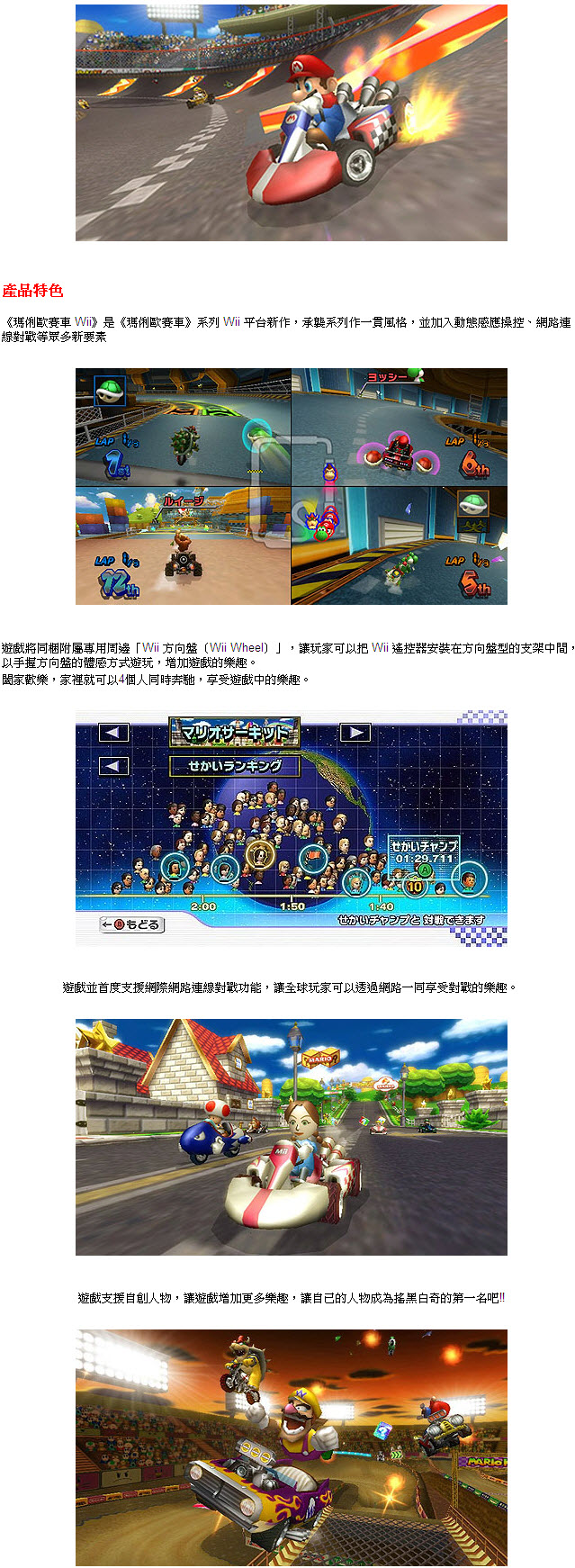 Wii《瑪俐歐賽車 Wii》預定 4 月 10 日推出,定價 5800 日圓,包裝中將同梱附屬「Wii 方向盤」1 組(零售定價 1200 日圓),與 Wii 遙控器組合後即可提供體感操作功能。