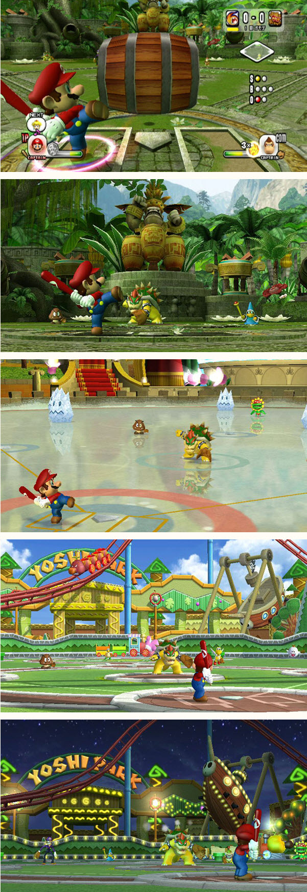 從一般球場到地面結凍會讓角色打滑的冰凍球場,遊戲共準備了 9 種球場。若不注意球場上的特殊效果就可能會陷入意想不到的危機,夜間比賽時球場效果似乎會有所變化。遊戲共收錄了 9 種小遊戲,另外還有召急同伴與庫巴的隊伍比賽的「挑戰模式」,以及其他可多人同樂的遊戲模式喔!