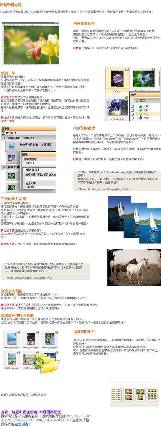 ACDSee 是世界上排名第一的數字圖像處理軟件,它能廣泛應用於圖片的獲取、管理、瀏覽、優化。 松管理記憶 ACDSee 相片管理器 2009 可以讓您快速地查看和尋找相片,修正不足,並通過電子郵件,打印和免費在線相冊來分享您的收藏。 再也不需要坐等某張圖片打開,ACDSee 2009是最快的瀏覽圖片軟件。讓圖片適合屏幕尺寸,通過縮略圖查看圖片,並且全屏查看。另外,通過ACDSee方便的Quick View功能,您可以快速查看電子郵件附件或桌面文件。 整理一切 掌握您所有的收藏。拖放相片到WindowsR文件夾,增加關鍵字和評級,編輯您的數據和創建屬於自己的類別。按照您的喜好給圖像指定盡可能多的類別卻不會佔用計算機更多的空間。一次性對圖片批量重命名,旋轉和調整大小。 新功能!立刻讓您的圖片變得有序。當您從相機或者其它存儲設備中導入圖片時的時候,就可以對圖片進行自定義類別、關鍵詞、創建備份和更多的內容。當導入過程完成時,文件便已整理好,並且已經為您瀏覽和分享做好了準備。 新功能!通過嵌入圖像XMP領域來更容易地分享圖片信息,例如分類、關鍵詞、等級。 破解說明: 1。安裝時選擇試用版進行安裝。 2。把crack目錄下的ACDSee11.exe拷貝至安裝目錄下復蓋原文件。