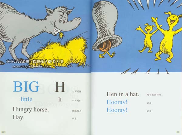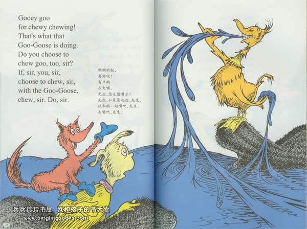 蘇斯博士的圖畫書在講述有趣故事的同時,更有一個特別的功能,即通過這些故事來使孩子們從興趣出發輕鬆地學習英語。 從簡單的字母,到短語、句子,再到一個個故事,蘇斯博士的圖畫書,亦是一套讓孩子們循序漸進掌握英語的優秀讀物。 例如其中《蘇斯博士的ABC》一書,就從英文的二十六個字母入手,將字母和單詞配合起來講解,同時,這些單詞又組成了一個個韻味十足的句子,不斷重複加深讀者對 字母的記憶和理解。 《一條魚兩條魚紅色的魚藍色的魚》和《在爸爸身上蹦來跳去》也是採取類似的方式進行單詞和句子的講解。 《穿襪子的狐狸》則是充滿了饒有風趣的繞口令,對誦讀者來說是一個充滿快樂的挑戰。