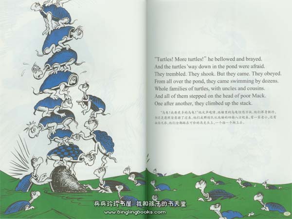 蘇斯博士(1904-1991),本名西奧多·蘇斯·蓋澤爾(Theodor Seuss Geisel),是美國人最引以為傲的兒童文學作家之一。 在白宮發布的美國文化“夢之隊”中,他的名字與《夏洛的網》的作者EB懷特以及《草原小屋》的作者懷爾德並列。 同時,蘇斯博士還是一位高妙的畫家,他會親自為自己的書繪製漂亮的插圖。 那些由他自己撰文並繪製插圖的作品都以“蘇斯博士”(Dr.Seuss)來署名,比如《穿襪子的狐狸》、《綠雞蛋和火腿》 、《霍頓孵蛋》、《烏龜耶 爾特及其他故事》等。 而由他本人撰文、別人插圖的作品則用Theo Lesieg(Lesieg是Geisel 的倒寫)和羅塞塔·斯通(Rosetta Stone)來署名,例如《頭頂十個蘋果》(The Apples up on Top) 〈小蟲打噴嚏〉 (When the Little Bug Went Ka-Choo)。
