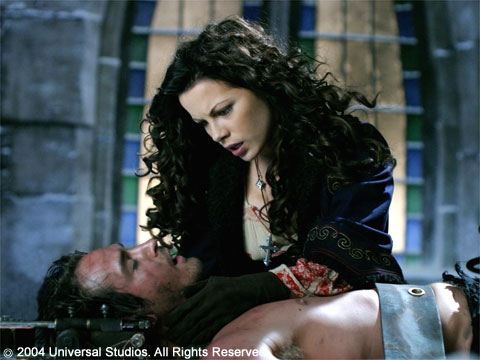 在特蘭西瓦尼亞古城揮灑醒風血雨的,還是脾氣活爆的狼人(威爾·肯普飾),以及吸血鬼德古拉的三個吸血鬼新娘:艾麗拉(埃琳娜·安娜婭飾)、薇羅娜(希薇婭·克洛卡飾)和瑪麗卡(喬茜·瑪蘭飾),這幾個蛇蠍婦人美麗妖艷卻更加狠毒。