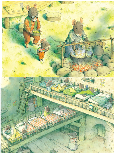 彭懿:這是一套在日本家喻戶曉的“大”圖畫書。第一,是它的開本足夠大。第二,是它的冊數足夠多,是一個大系列,一共有十二本。第三,是它的發行量足夠大。在出版這套書的出版社童心社的宣傳手冊上,高調地寫上了它的發行量:800萬。整個系列中發行量最大的一本,是第二本《14隻老鼠吃早餐》,賣出了100萬冊。或許有人會說,這會不會是出版社的虛假廣告呢?不是的,我查了一下版權頁,第一本《14隻老鼠大搬家》到2009年4月累計再版了92次﹔第二本《14隻老鼠吃早餐》到2009年數月累計再版了100次……再說,也實在沒有必要去騙人,因為這套圖畫書在日本實在是口碑太好,太深入人心了。第四,它的壽命足夠長。第一本《14隻老鼠大搬家》是1983年問世的,到今年2010年,已經整整過去27年了。所以,作者岩村和朗才會開心地這樣寫道:我最高興的一件事情,就是讀者在信中告訴我,我們是二十幾年前認識老九和老十(都是書中的人物)的,那時還是個孩子,現在我們都已經成了媽媽了,每天又和孩子們一起重溫兒時的快樂時光……這套圖畫書的魅力在哪裡呢?其實就是兩句話,一是美麗的大自然,二是溫暖的大家庭。一位日本媽媽的發言很有代表性:“美麗的圖畫,簡單的故事,讓人的心中擁有了一份溫暖和寧靜。我女兒三歲,最喜歡14隻老鼠大家庭一起吃飯的場面。最近呢,我們則熱衷於找尋藏在畫中的昆蟲、四腳蛇和小鳥,在圖畫書的大自然中散步。”找尋,是孩子們閱讀這套圖畫書的最大樂趣。