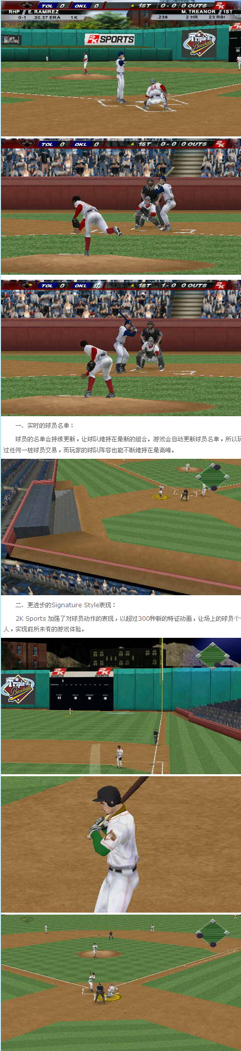 在新作《美國職業棒球大聯盟2K9》(Major League Baseball 2K9)中,將忠實地呈現出棒球比賽的精髓,而球員的特徵,像是打擊姿勢、投球的準備動作以及每位球員特殊的揮棒動作也都栩栩如生。開發商2K Sports用心盡力的製作,終於呈現出如此貼近大聯盟風格的遊戲。在投球、打擊、守備及跑壘的表現上都有許多進步,讓新老玩家都能很快的就熟悉這款遊戲的控制。而新的播報與評論內容,則讓球賽的進行更加緊扣心弦。想真正感受大聯盟的魄力嗎?選擇這款遊戲就對了。一、實時的球員名單: