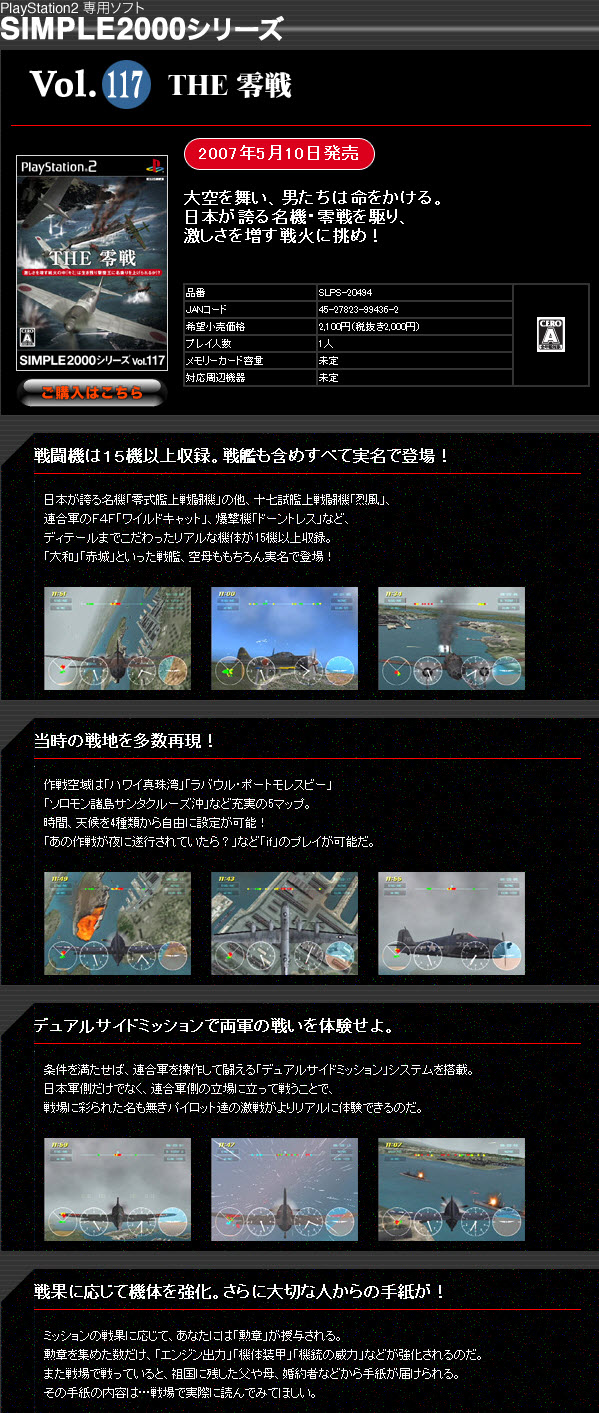 由D3製作的射擊遊戲零戰正式登陸家用機PS2">PS2平台,大受好評的2人對戰模式也將收錄,本作也支持通過分屏模式進行對戰。除了保留系列作一貫爽快的手感以外,遊戲畫面也是亮點之一,每一個飛機零件的建模,飛機被擊中後明顯的損傷,爆炸效果,再加上60幀每秒的流暢遊戲畫面,如此出色的畫面效果也是該作人氣旺的重要原因之一。