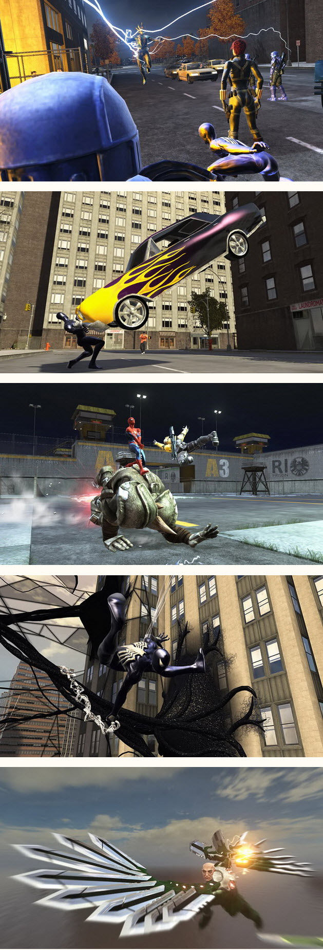蜘蛛絲已經是蜘蛛人最不可或缺的超級能力之一,除此之外,在系列遊戲中,這次是第一次玩家可以在垂直的維度中進行戰鬥,例如在大樓的外牆上。在這裡,蜘蛛人可是有很大的優勢的。