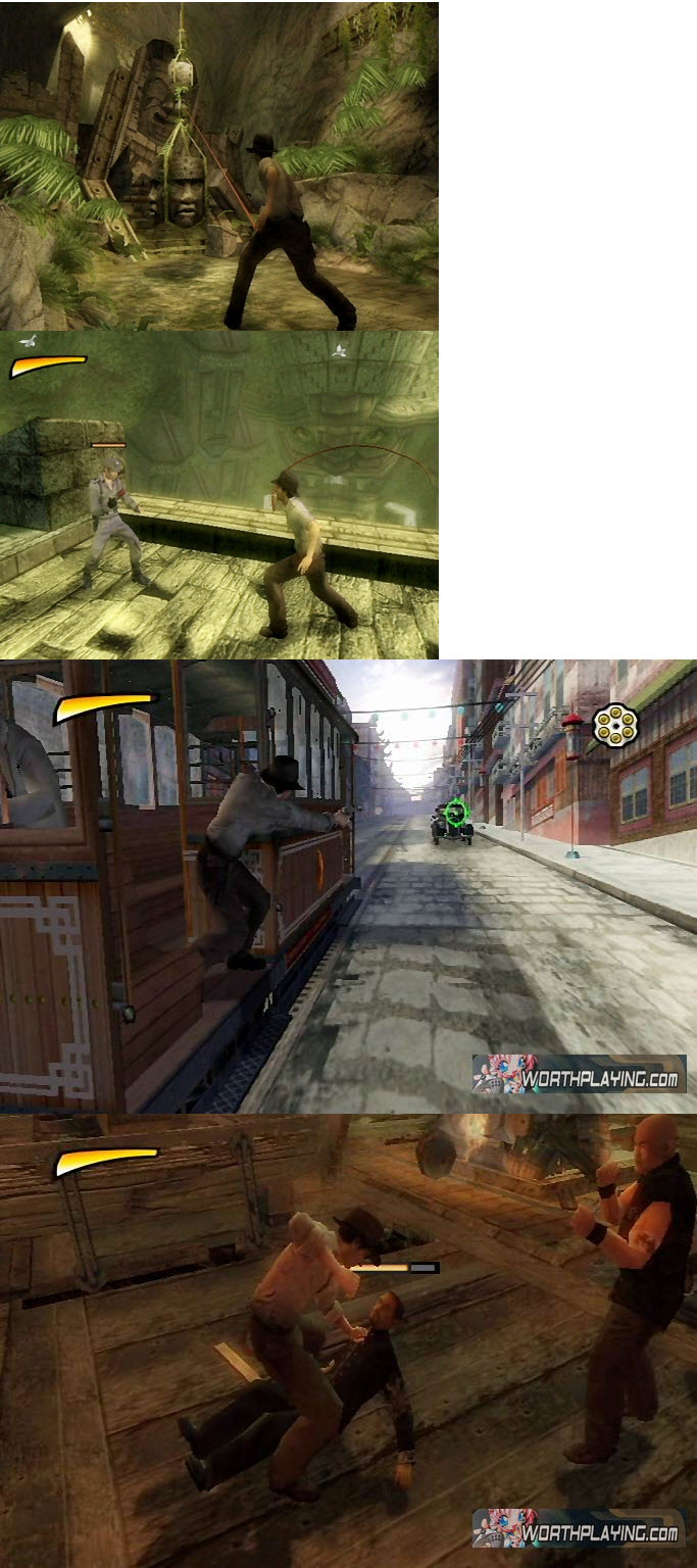 遊戲中包含格鬥、槍戰和駕駛等豐富的元素,其中駕駛部分除了普通的吉普車和滑翔機以外,還包括大象這樣的極富特色的交通工具。遊戲支持最多4名玩家進行對戰,另外還能開啟經典的《印第安納瓊斯與亞特蘭蒂斯宿命》。
