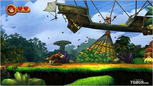 就像馬里奧大叔永遠都是去救碧奇公主一樣,大金剛的生存目的就是把各種阿貓阿狗偷走的香蕉搶回來,順便再海扁他們一頓。而本作一上來,我們看到的就是大金剛島上火山爆發的壯觀場面,火山上的神秘的樂器假面族突然蹦了出來,他們二話不說,就運用音樂催眠的本領,將小島上的動物們全部推倒催眠,不過讓人十分費解的是,他們有這種本事,竟然只是為了偷香蕉。大金剛珍藏的香蕉被一點不剩全部拿走。