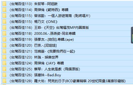 軟體名稱: 台灣百佳 台灣流行音樂 朱哲琴+周傑倫+曾淑勤+楊乃文+王菲+孫燕姿+張學友+巴奈+范曉萱+林強+蔡琴+張惠妹+羅大佑(13CD合成1片DVD) 無損音樂 DVD版
