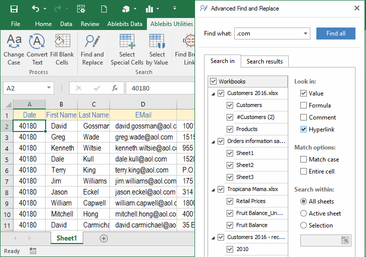 – 查找(和替換)在一次所有打開工作簿,搜索值,公式,超鏈接等。