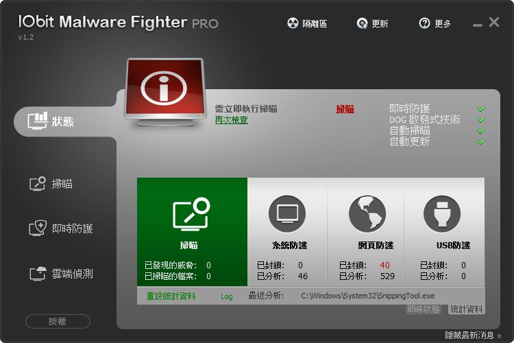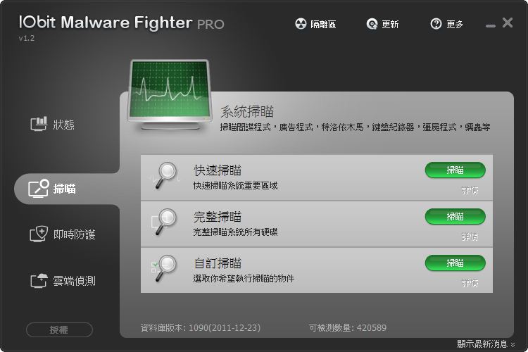 防火牆一起使用,具有手動掃描和即時監控的功能,可以防堵間諜軟件、廣告軟件、木馬、蠕蟲、鍵盤側錄、流氓軟件等惡意程式的入侵。">IObit Malware Fighter可以同時和防毒軟件、防火牆一起使用,具有手動掃描和即時監控的功能,可以防堵間諜軟件、廣告軟件、木馬、蠕蟲、鍵盤側錄、流氓軟件等惡意程式的入侵。採用獨特的「雙核」反惡意軟件引擎和啟發式惡意軟件檢測的方法,可以快速找到最底層的感染。適合Windows 8, Windows 7, Vista, XP 和2000 (32bit 和64bit)。 IObit Malware Fighter 是您防毒軟件的最佳搭檔。
